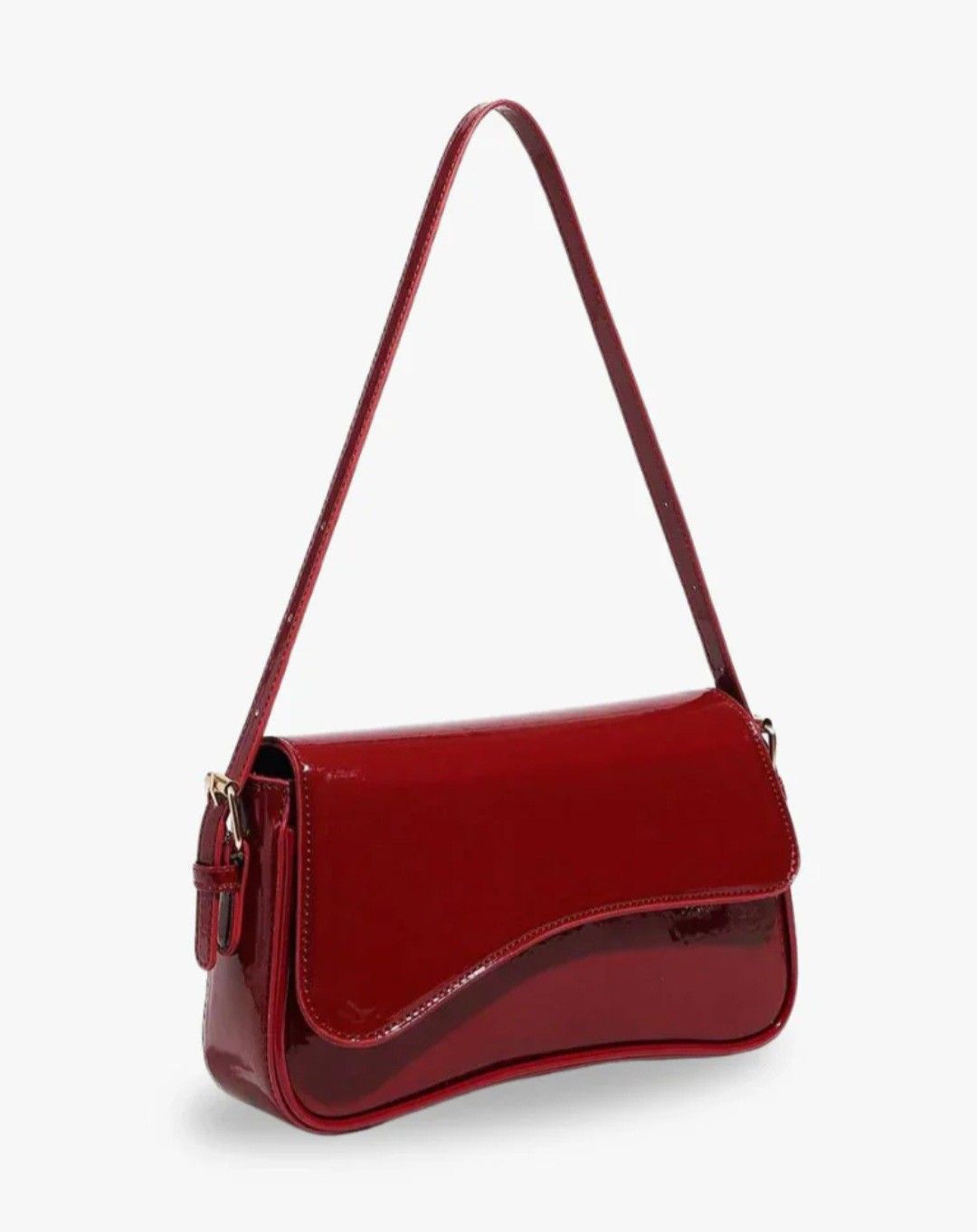 A bold and glossy red clutch bag that offers a pop of color with refined sophistication for evening events.